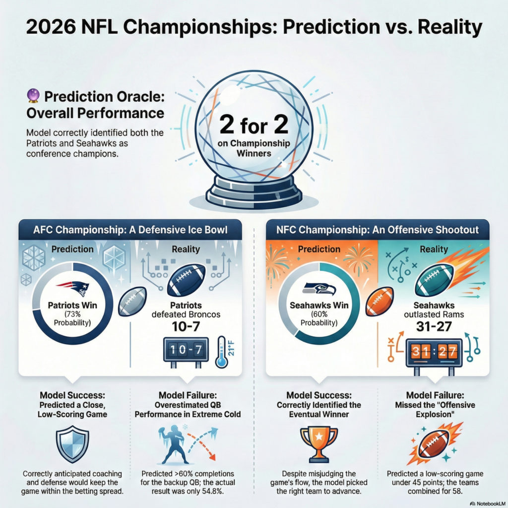The Prediction Oracle v3-enhanced model successfully identified both conference champions. Super Bowl LX will feature a rematch of Super Bowl XLIX: The New England Patriots vs. The Seattle Seahawks.